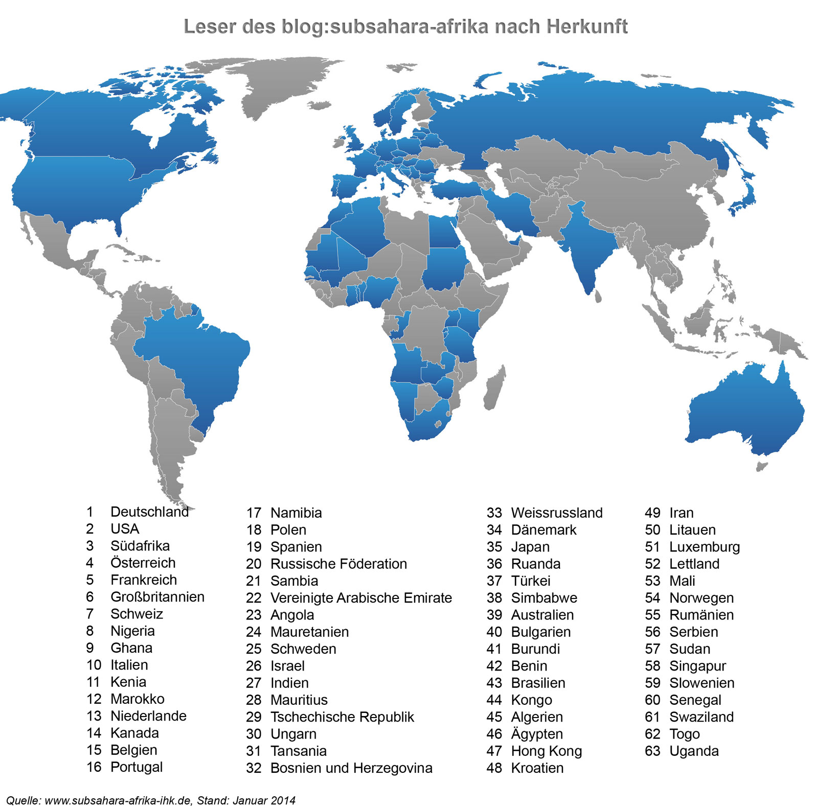Die Blog-Leser kamen 2013 vor allem aus Deutschland, den USA, Südafrika, Österreich, Frankreich, Großbritannien, Schweiz, Nigeria, Ghana und Italien – das Gros der Leser (etwa 85 Prozent) stammt, wenig überraschend, aus Deutschland.