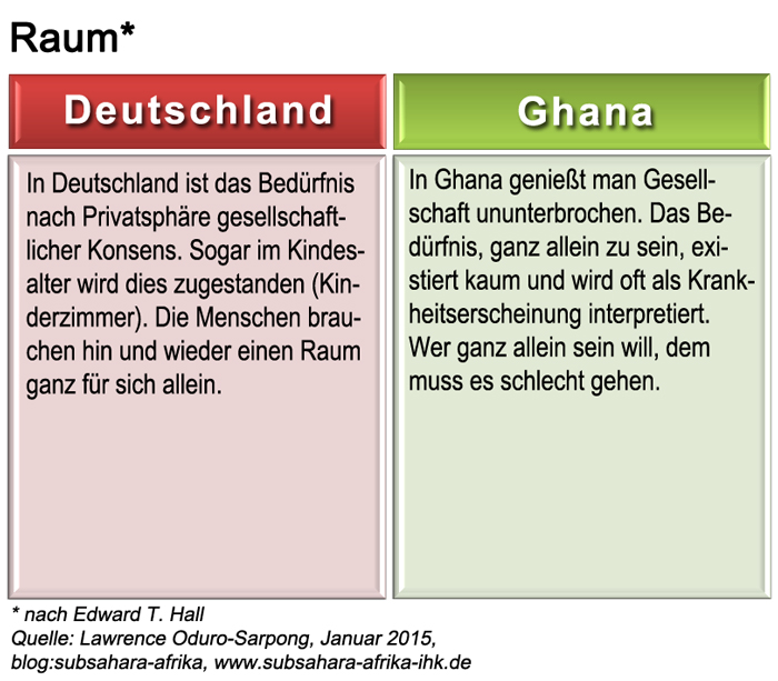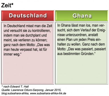Deutsche und Ghanaerinnen und Ghanaer haben die Gemeinsamkeit, dass sie ihr Land mögen. Auch das „Chilling“ haben sie gemeinsam, indem sie nach Feierabend oder am Wochenende in die Bar oder Kneipe gehen, um mit Freunden etwas zu trinken. An Feiertagen unternimmt man gerne etwas, man veranstaltet ein Picknick oder man fährt an den See oder Strand um zu feiern. Unterschiede gibt es aber reichlich. Als spirituelles Volk nehmen es die Ghanaerinnen und Ghanaer sehr ernst mit der Religion, sei es mit dem Christentum, Islam oder anderen Religionen. Sonntags gehen auch junge Menschen zahlreich in die Kirche, während man in Deutschland eher Senioren und Kleinkinder antrifft. Auch bei Arbeitssitzungen wird in Ghana nicht selten vorher und nachher gebetet. Ghanaerinnen und Ghanaer sind harmonieorientiert, während Deutsche zur Schuld- und Problemorientierung neigen. Die Trennung von Männer- und Frauenrollen findet in der ghanaischen Gesellschaft auch bei Akademikerinnen Zustimmung, während sich die Rollen in Deutschland zunehmend vermischen.