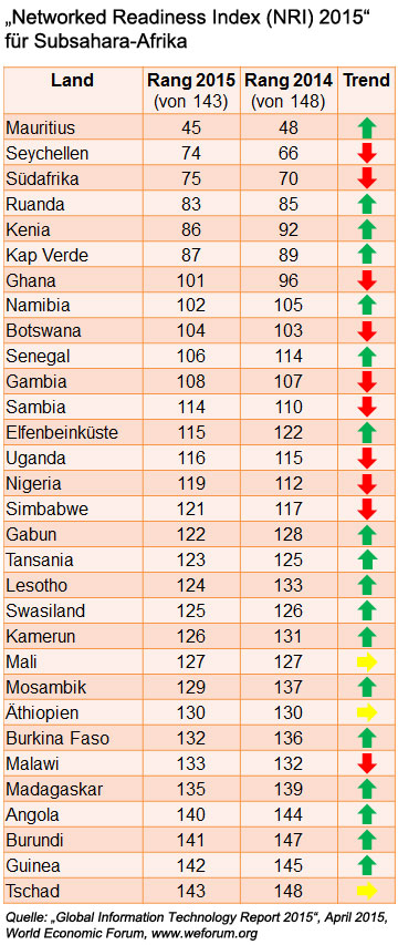 Der Global Information Technology Report (GITR) 2015 des Weltwirtschaftsforums analysiert die Netzwerkfähigkeit von 143 Volkswirtschaften. Demnach werden wirtschaftliche und soziale Vorteile des Internets nur einem Bruchteil der Weltbevölkerung zu Teil. Unter den 31 untersuchten Staaten Subsahara-Afrikas schneidet Mauritius am besten ab. Eine vergleichsweise gute Platzierung in dieser Gruppe erzielt auch Südafrika.