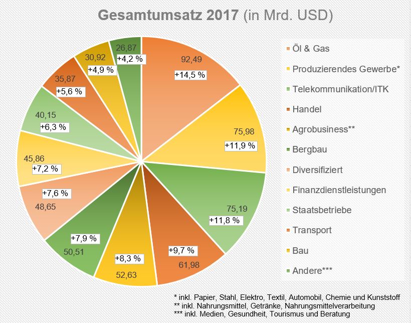 Insgesamt befinden sich die Volkswirtschaften Afrikas aktuell in einer Erholungsphase. Laut afrikanischer Entwicklungsbank lag das Wachstum des Bruttoinlandsprodukts 2018 bei 3,5 Prozent. Es soll 2019 und 2020 um weitere 0,5 Prozentpunkte wachsen. Dementsprechend sind auch fast alle Märkte und Sektoren des Rankings 2017 im Vergleich zum Vorjahr gewachsen. Mit 13,6 Mrd. USD hat der Öl- und Gas-Sektor das größte Wachstum verzeichnet. Auch die verarbeitende Industrie sowie die Bereiche Telekommunikation und Finanzen erreichten zweistellige Wachstumsraten.